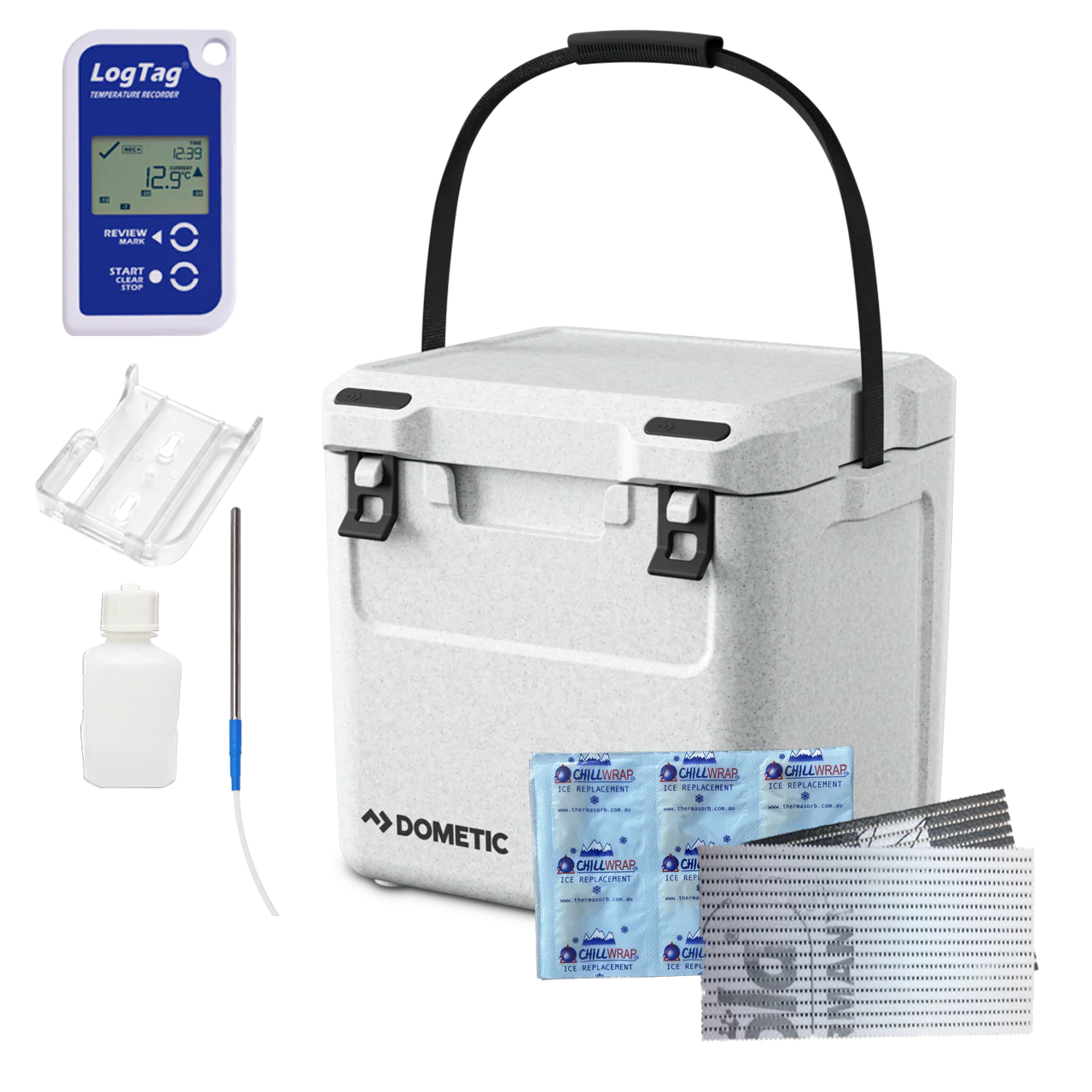 System supplied with LogTag mounted on chill box lid with temperature probe fitted through lid and glycol bottle attached. Please note: cool glycol bottle in fridge to approx 5C for 2 hours prior to starting LogTag and transferring vaccines to chill box.