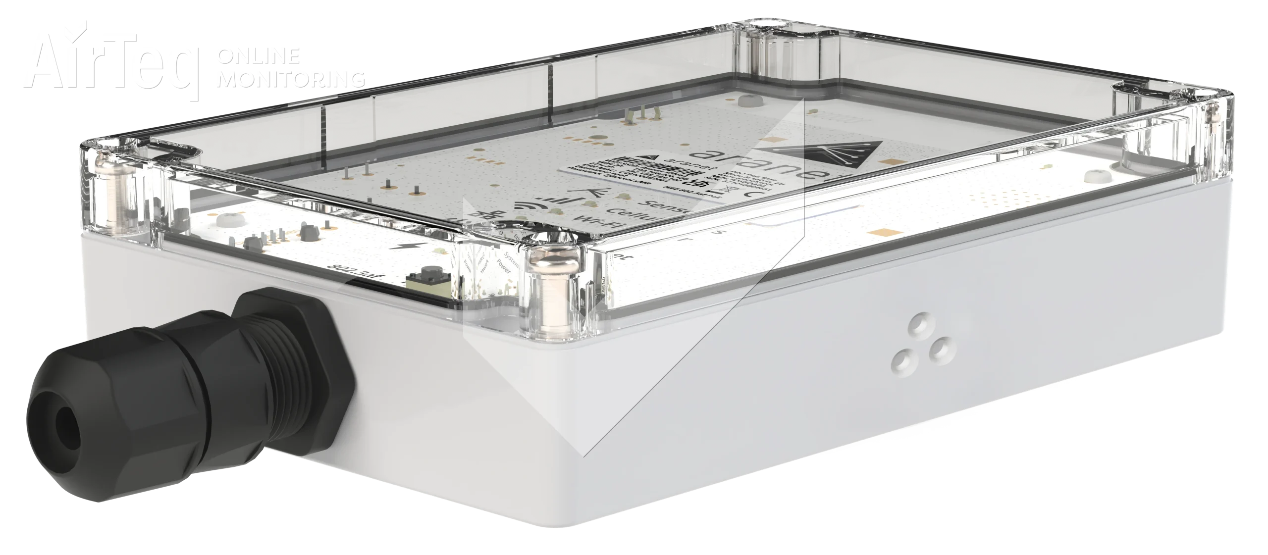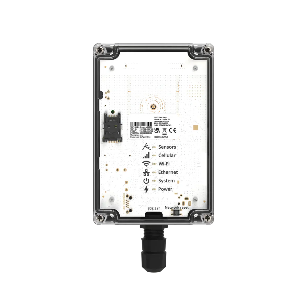 Base station collects data from multiple sensors and provides independent local data storage within its free software, is compatible with Aranet Cloud for a complete experience, and offers third-party integration possibilities (MQTT, Modbus TCP/IP, BACnet IP, InfluxDB). Aranet PRO Plus LTE base station has IP67 protection grade and incorporates a 4G LTE modem as well as Wi-Fi and Ethernet network interfaces.