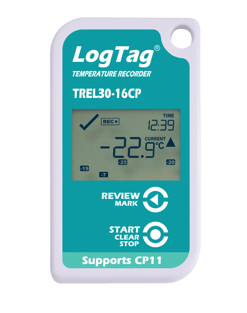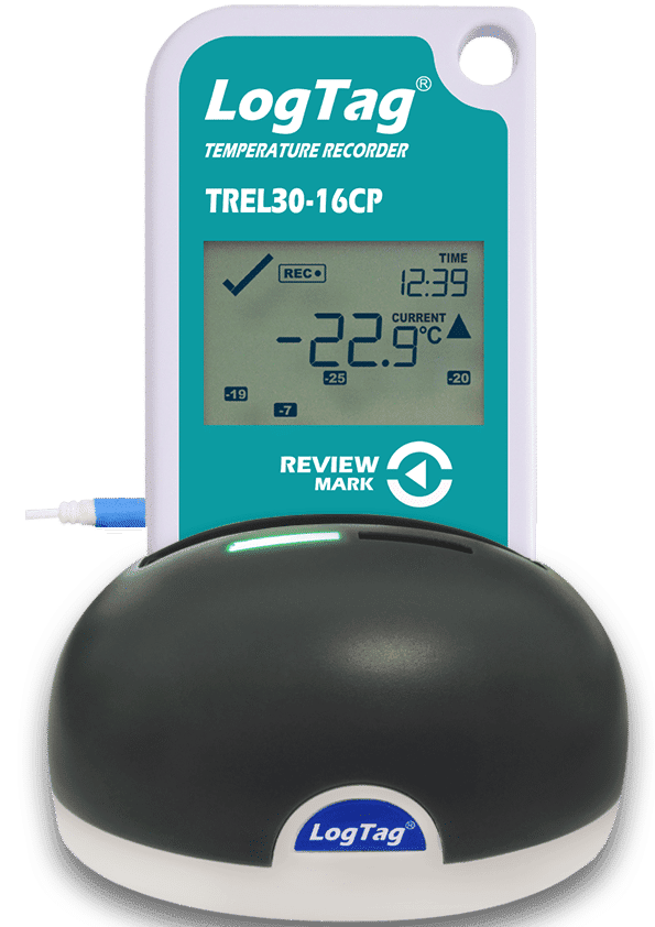 he LogTag® TREL30-16 Temperature Recorder measures and stores up to 15,900 temperature readings over a -80°C to +40°C (-112°F to +104°F) measurement range from associated interchangeable LogTag ST10 remote probe temperature sensor (available in lengths up to 3 metres (9’10”). The display is designed to show ‘at a glance’ if temperature excursions have occurred during the current day and up to the previous 29 days. The display also shows the current temperature reading, the current time, recording status and battery status. The alarm is triggered if temperature readings are outside pre-set alarm limits. The status indicator changes from a ✓ to a ✗ and, if configured, the audible alarm will sound. The day marker will also appear if not already present. The alarm status indicator and audible alarm can be easily cleared, but the day marker remains to ensure a visible record of excursions is shown on the display. A simplified alarm clearance, stop & start procedure is available as an option. Details of any excursions in the preceding 30 days can be checked directly by inspecting the statistics history on the recorder’s display or in more detail by downloading the logged data via a standard LogTag Interface cradle to LogTag Analyzer operating software.
