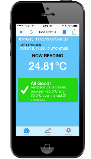 The Pod PB2 Bluetooth data logger records and wirelessly transmits temperature data and excursion alerts to your smartphones and tablets; no cables or readers required! Simply download Verigo’s app for Android or iOS to your smart device and start using your Pod.